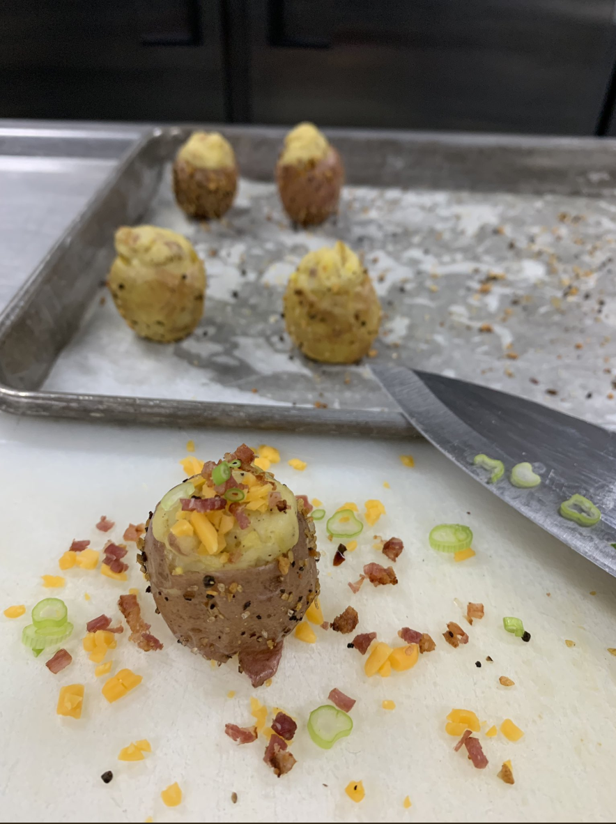 Our Mini Twice Baked Potatoes are off of our new menu! We top these with sharp cheddar cheese, bacon, and scallions.